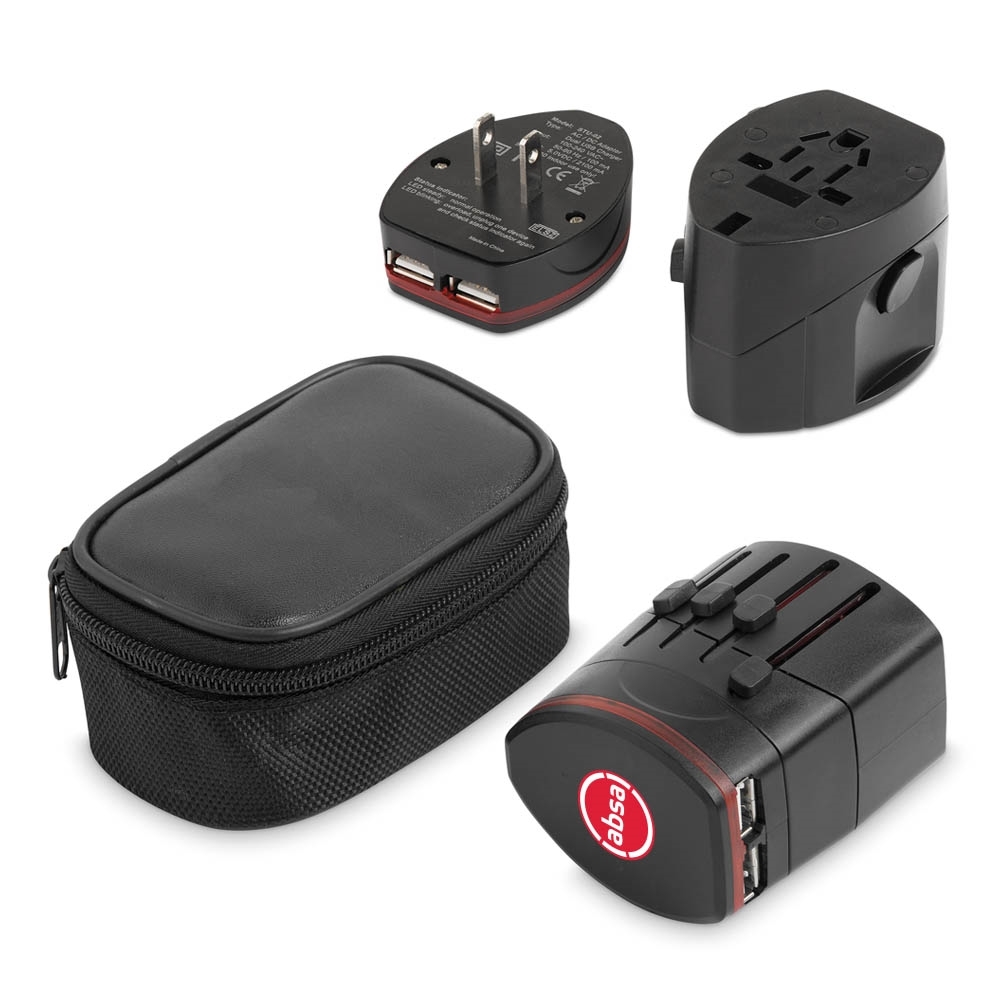 All-in-one USB and AC adapter that will work in over 150 countries. Charge notebooks, smartphones, and other devices world wide • USB & AC. FCC certification • ABS travel adaptor: 6.3 ( l ) x 4.7 ( w ) x 7 ( h ) • Packaging: 1680D pouch | Size: 11 ( l ) x 7 ( w ) x 5 (h )