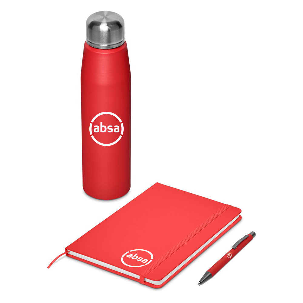 An aluminium bottle with a rubberised finish, a notebook and a ball pen are neatly presented together in a gift box. The pen has a matte finish and reveals a matte white finish when lasered. This set is suitable as a client gift, or for staff and onboarding of new members to the team. A pre-packaged gift set not only looks impressive but can also be a convenient and practical option when it comes to transport and delivery.