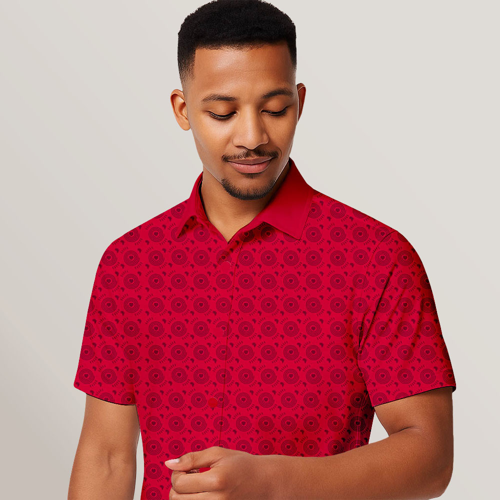 Fully dye sublimated short sleeve button down lounge shirt with contrast fused collar.