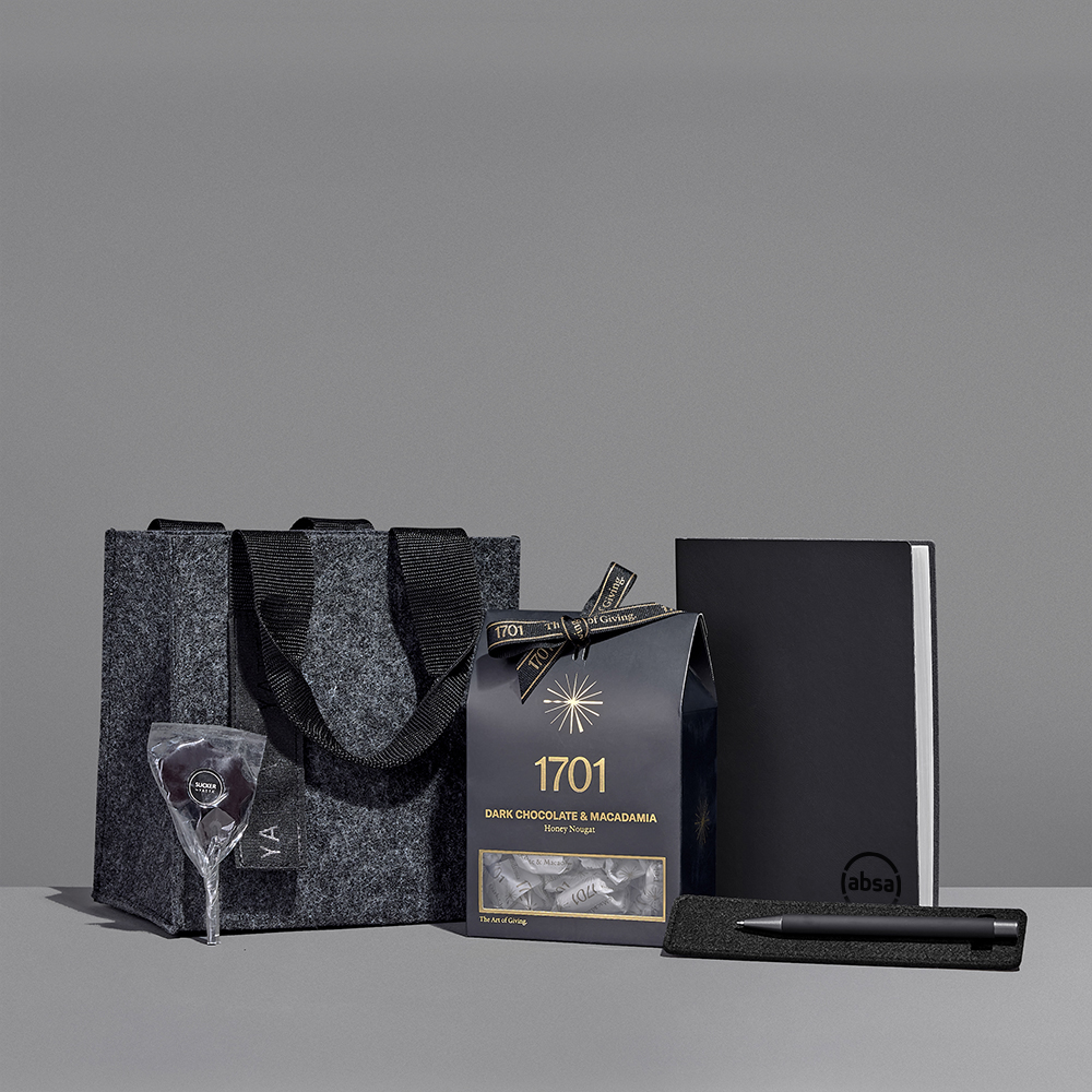 The Yatta range of hampers is expertly crafted to provide a delightful experience with a curated selection of premium items and edible treats. Elegantly presented in a Yatta drawstring bag, this hamper is further encased in a durable Dark Grey RPET felt gift bag.